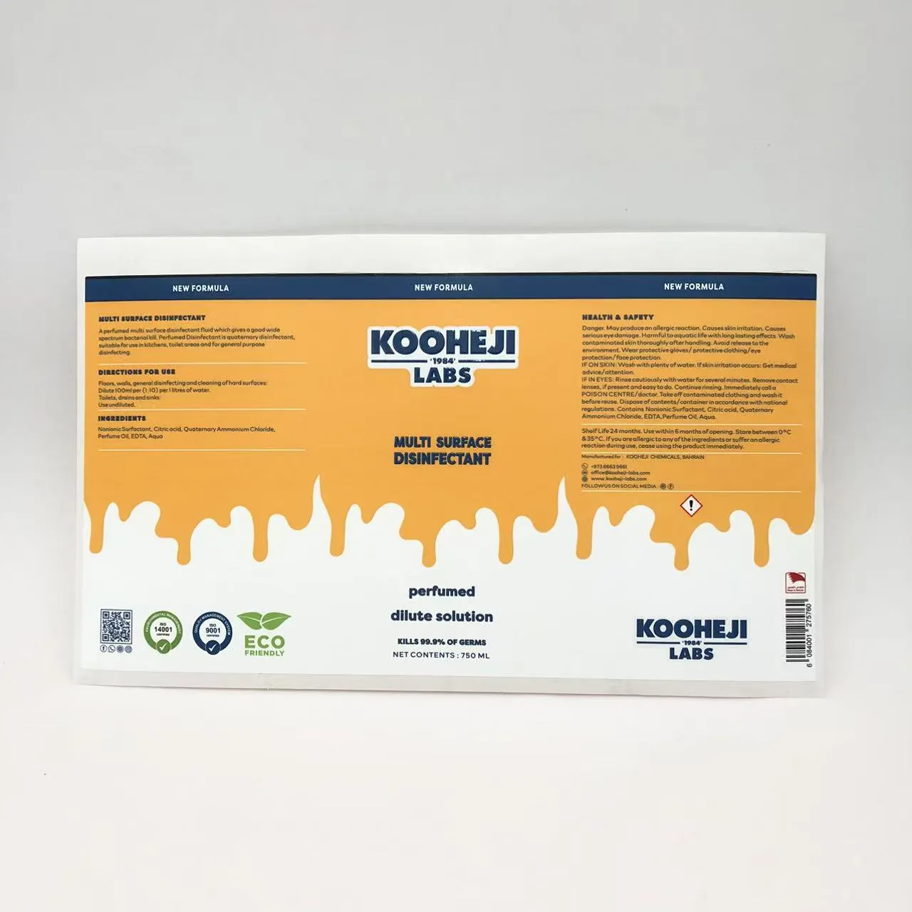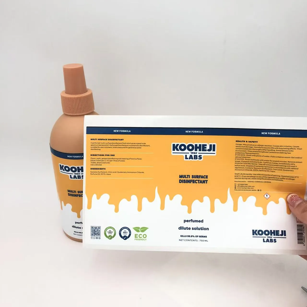 Pacote JOJOengajado profundamente na personalização de rótulos de embalagens de frascos desinfetantes, estamos familiarizados com os requisitos de materiais e padrões de segurança de produtos desinfetantes nas áreas médica, doméstica, comercial e industrial, garantindo que os rótulos personalizados se adaptem totalmente aos ambientes de uso adversos.