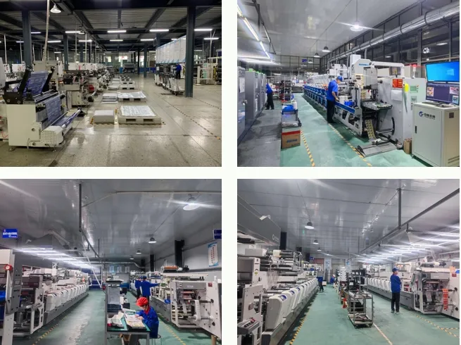 A JoJo Pack Company possui uma fábrica que cobre uma área de 18.000 metros quadrados, com 7 linhas de produção totalmente automáticas, equipadas com uma série de equipamentos avançados, como máquinas de impressão CMYK, máquinas de impressão digital, máquinas de corte, máquinas de rebobinagem, máquinas de carimbo quentes e cortadores de papel. Seja uma grande empresa ou uma empresa pequena e de tamanho médio, podemos atender às suas necessidades OEM e ODM.