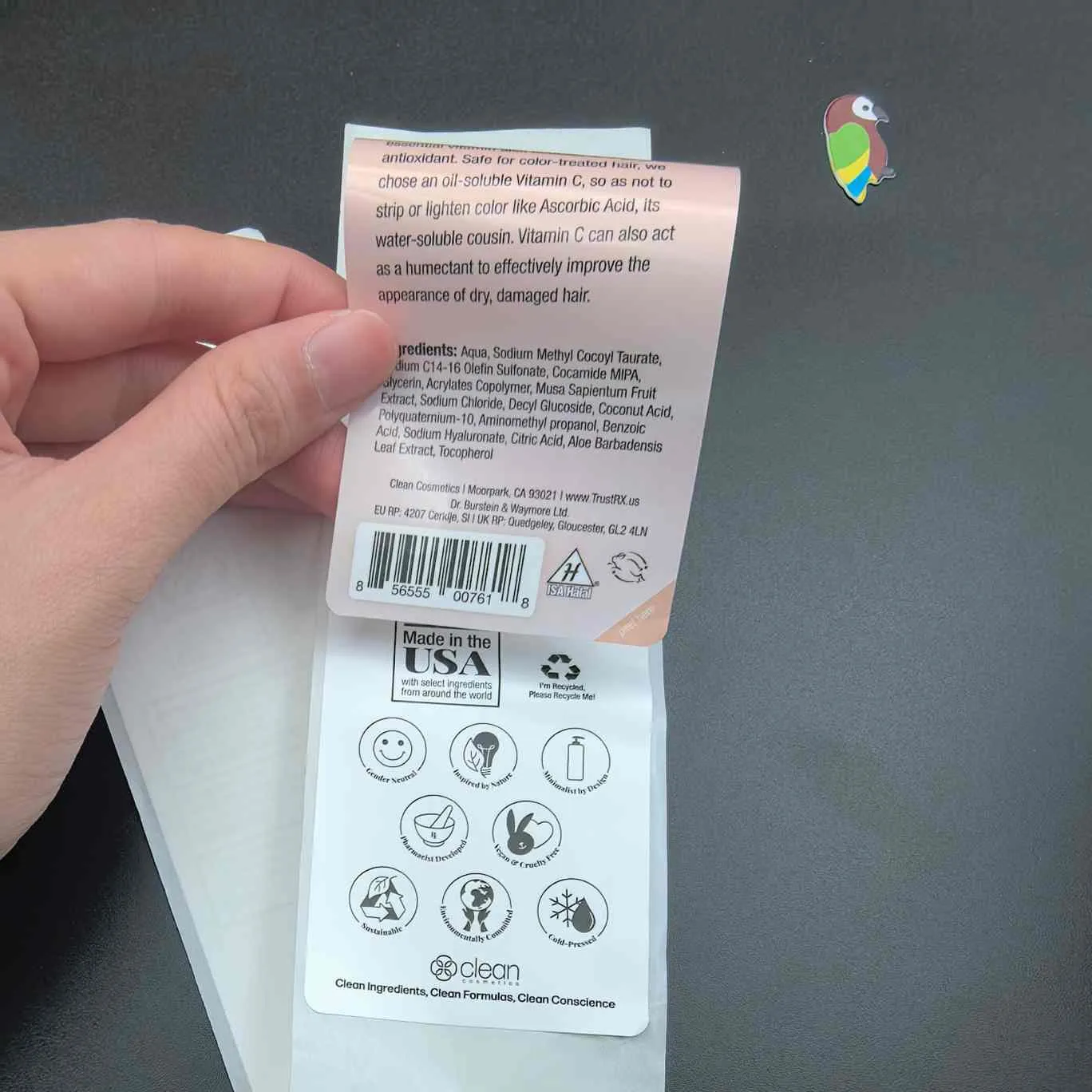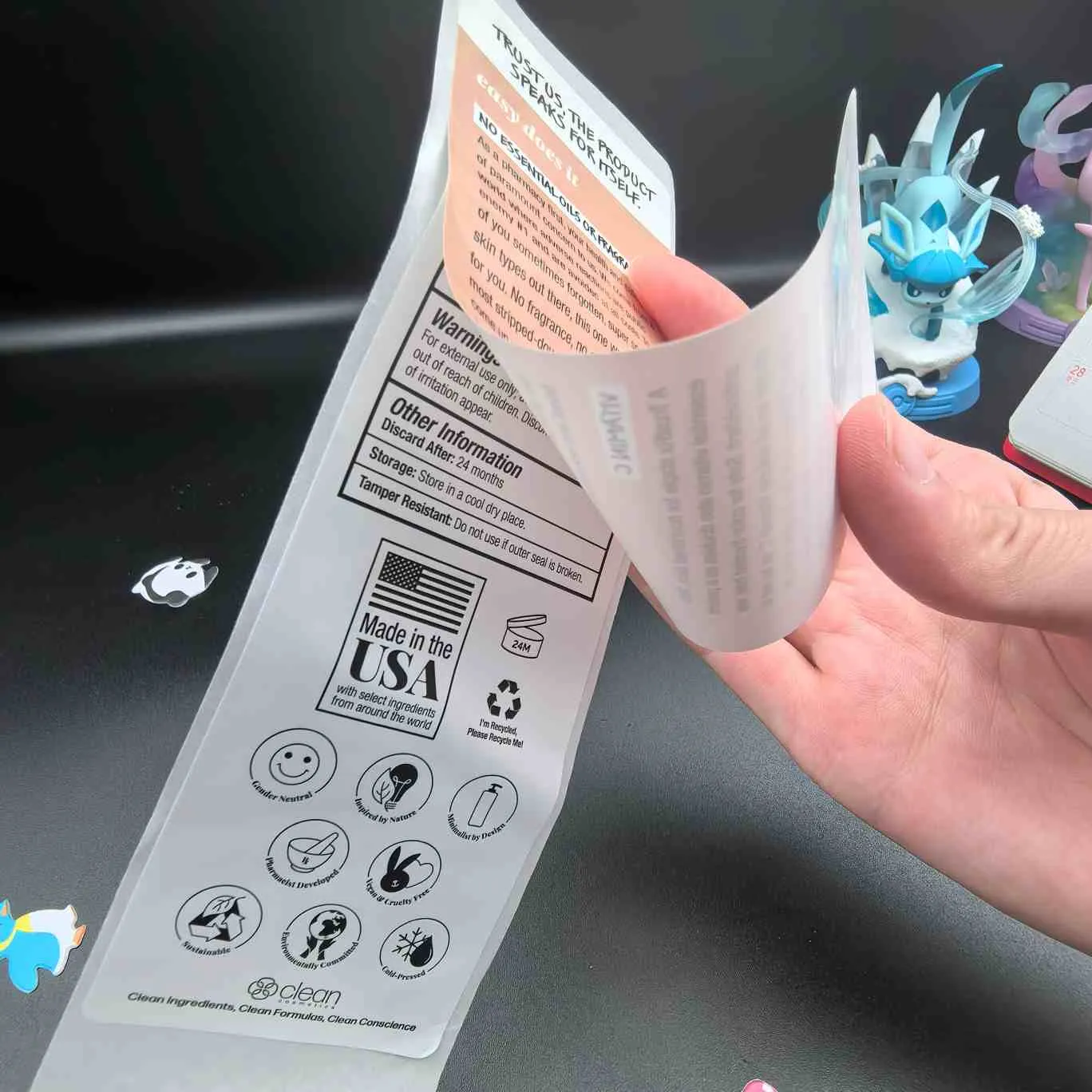 MultiLayer para rótulos cosméticos, também conhecidos como rótulos cosméticos multicamadas, referem-se a um design de rótulo especial amplamente utilizado na indústria cosmética. Consiste em duas ou mais camadas de materiais de etiqueta unidas. Ao contrário das etiquetas tradicionais de camada única, os usuários podem retirar a camada superior para revelar informações adicionais impressas na camada interna.