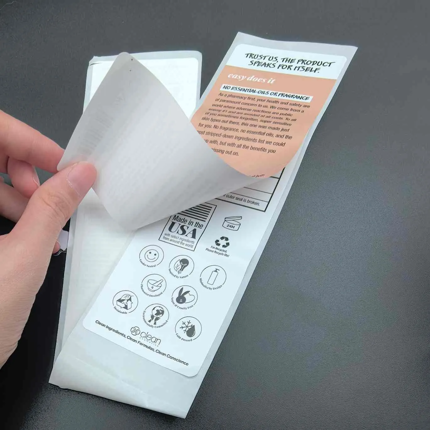 Descasque e leia os rótulos:O tipo mais básico, também chamado de multicamada para rótulos de cosméticos. A camada superior é fácil de remover e a camada interna contém informações estendidas. É frequentemente usado para máscaras faciais, soros e outros produtos de embalagens pequenas.