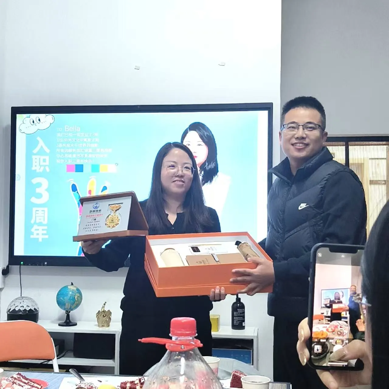 Como uma surpresa maravilhosa, Boss Gao também presenteou pessoalmente lindos presentes de aniversário de trabalho para Tom e Ella, e para a gerente Bella. Esses tokens especiais são um reconhecimento sincero de suas contribuições nos últimos anos e trazem nossos melhores votos de crescimento contínuo com a empresa.