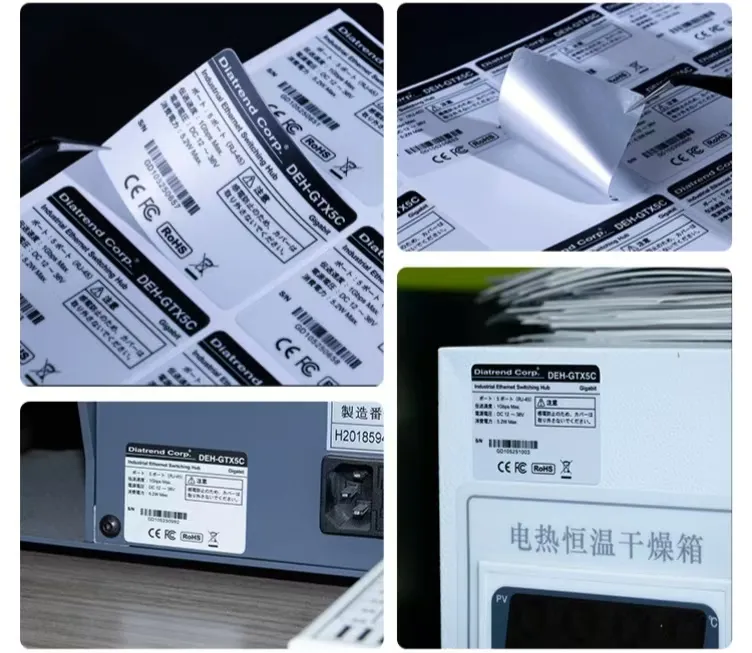 PET branco/prata fosco: Resistente ao calor até 150 ℃, adequado para placas de identificação em eletrodomésticos e adaptadores de energia.