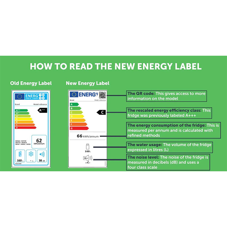 Codificação de cores clara:Etiquetas de eficiência energética para refrigeradoresuse notas de A a G. Geralmente a nota A é verde, indicando o mais eficiente, enquanto o grau G é vermelho, indicando o menos eficiente. Este código de cores ajuda os consumidores a identificar rapidamente a classificação de eficiência energética de um produto.