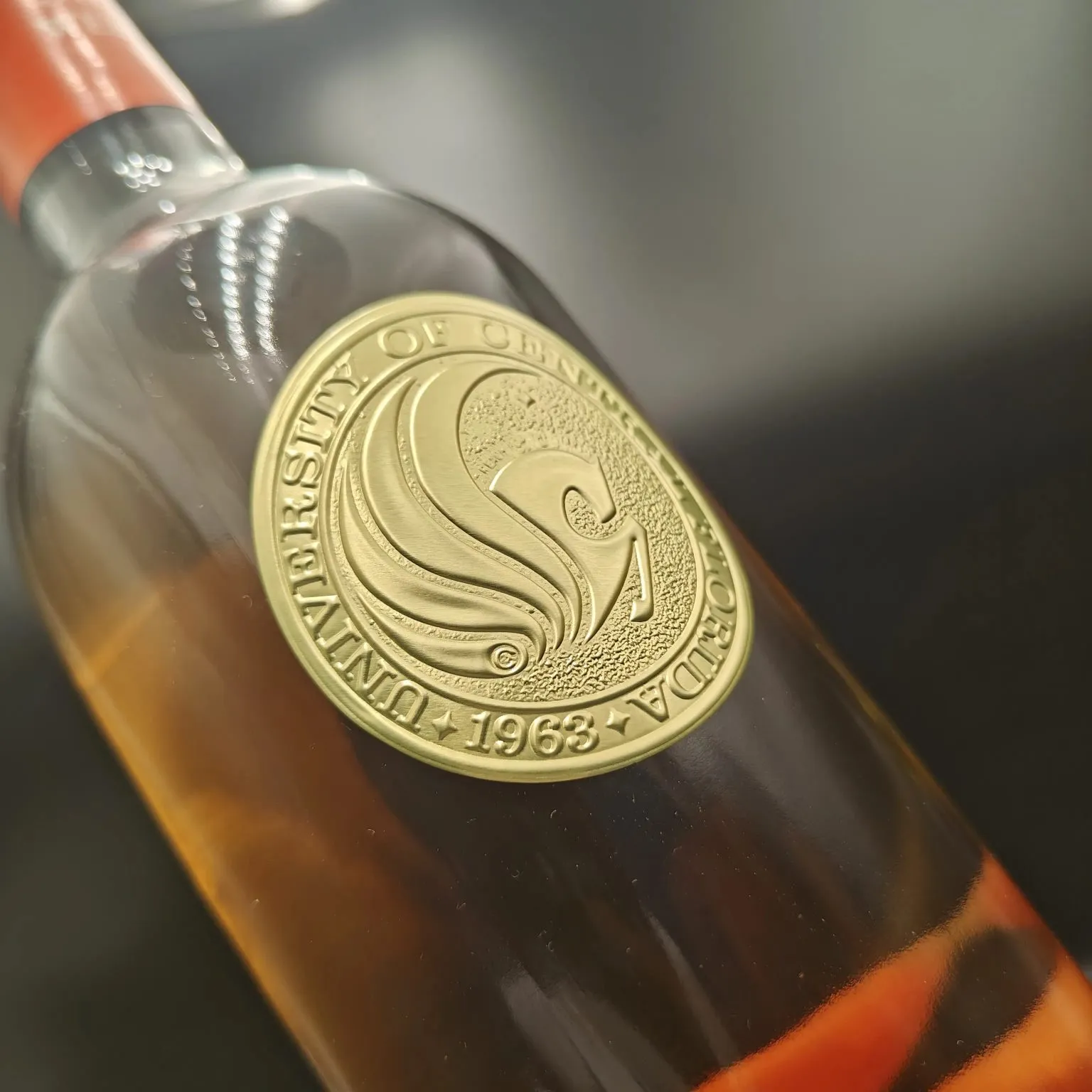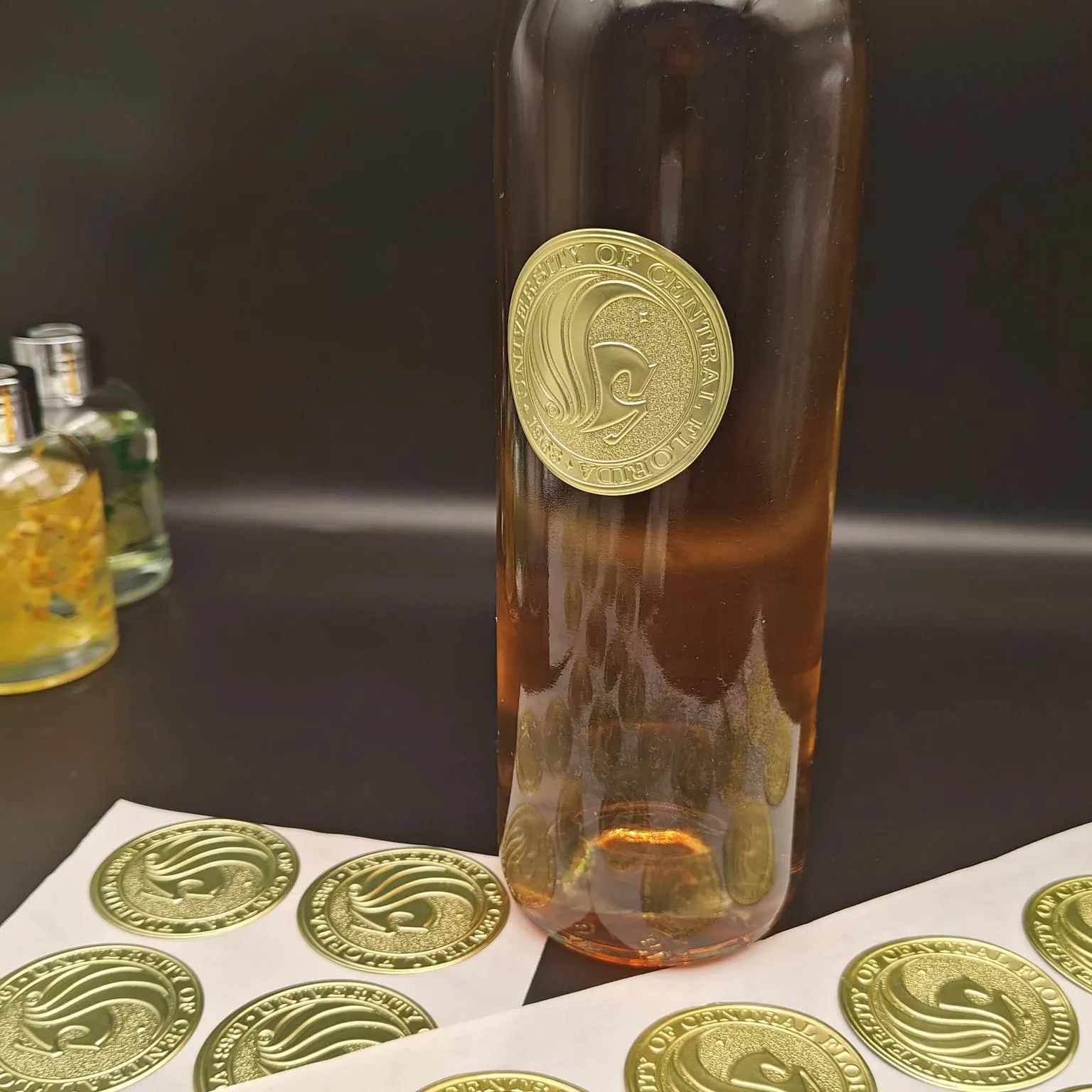 Rótulos de vinho em folha redonda em relevo são rótulos autoadesivos com base circular, onde a folha metálica é transferida para a superfície do material por meio da tecnologia de estampagem a quente e, em seguida, os padrões em relevo são prensados usando moldes côncavo-convexos. Como uma medalha em miniatura, o brilho metálico e a sensação tátil tridimensional do rótulo podem elevar instantaneamente a sensação premium de uma garrafa inteira de vinho, uma vez fixada suavemente no corpo da garrafa.