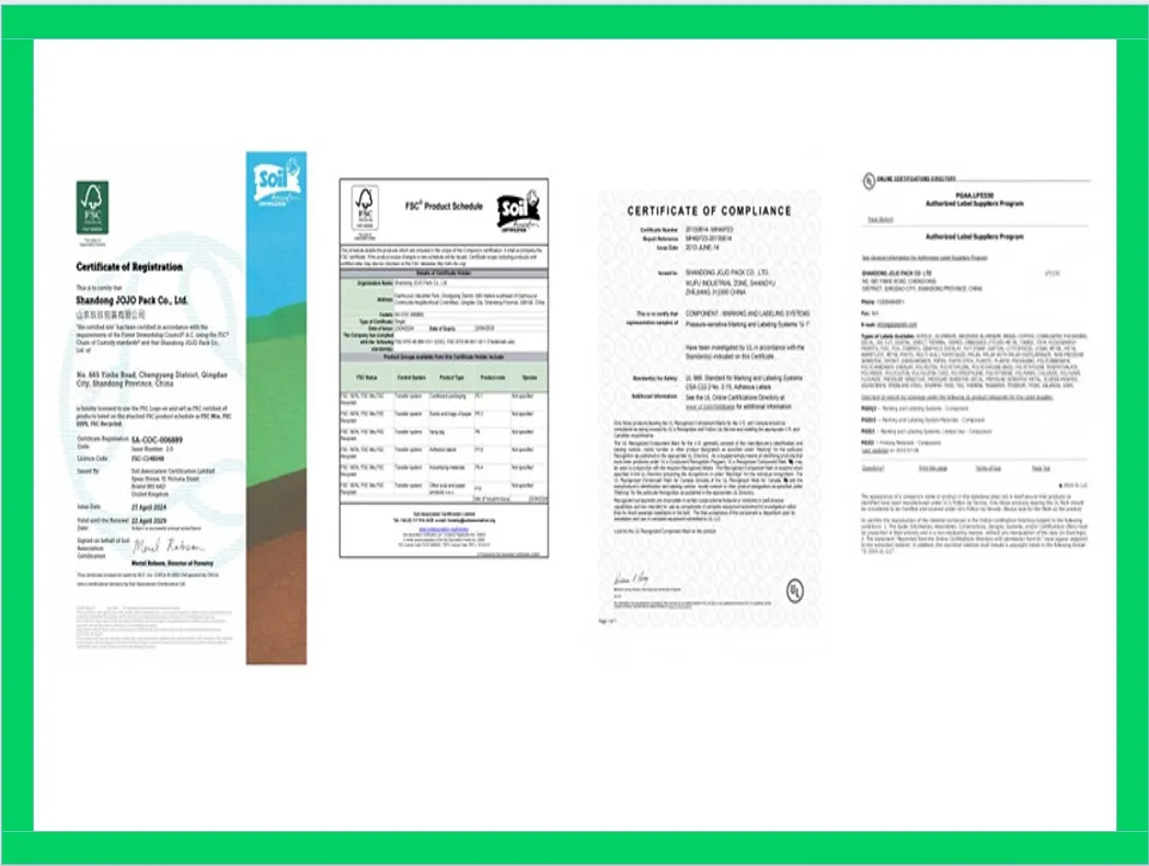 Os produtos da JoJo Pack obtiveram a certificação FSC e UL, e os padrões de produção de etiquetas totalmente alinhados com os padrões internacionais. Temos uma equipe profissional de pós-venda responsável pelo transporte de produtos, serviço pós-venda e feedback do cliente, o JoJo Pack espera conquistar sua confiança com produtos e serviços de alta qualidade, ajudar seus produtos mais competitivos e a alcançar a cooperação vencida.