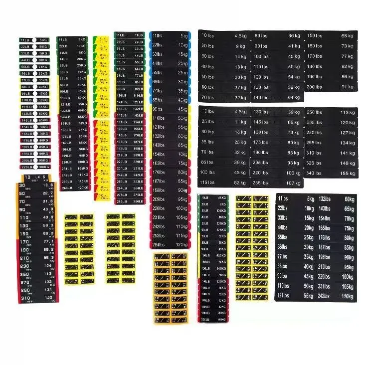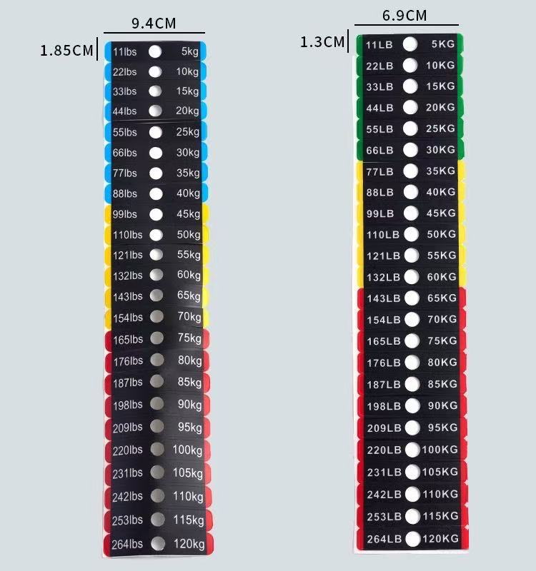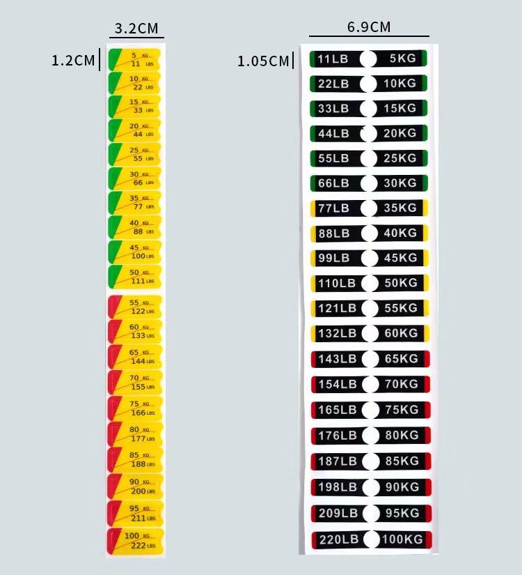 Esses adesivos de peso para blocos de peso de equipamentos de fitness são um tipo de adesivos de identificação especialmente projetados para rotular o peso de equipamentos de fitness. Geralmente são feitos de material de PVC e você pode consultar a tabela de parâmetros do produto para dimensões específicas. Os valores de peso estão claramente marcados nos adesivos, permitindo aos usuários identificar e selecionar rapidamente o peso de treinamento adequado.